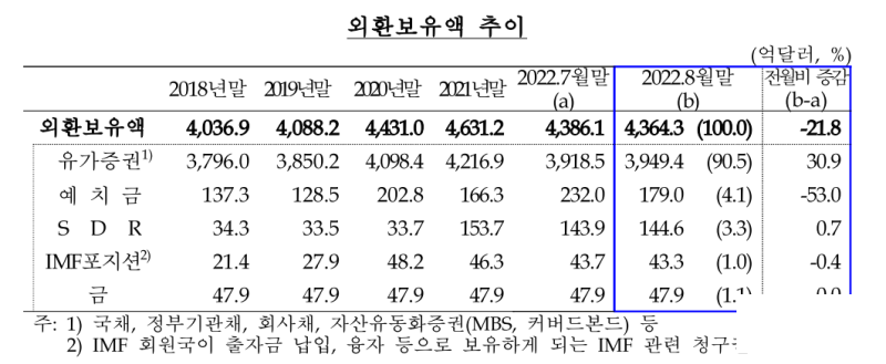 한국은행 관계자는 "지난달 외화자산 운용수익, 금융기관 외화예수금 증가 등에도 불구하고 미국 달러가 약 2.3% 평가 절상되면서 기타 통화 외화자산의 미국 달러화 환산액이 줄어 전체 외환보유액도 감소했다"고 설명했습니다.
