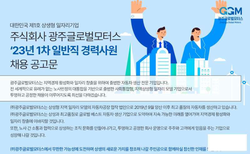 GGM은 4만 5천 대 생산목표 달성을 위한 인력 보충과 전기차 기반구축(AX_EV) 조기 안정을 위해 기술직 29명과 일반직 9명(경력사원 4명 포함) 등 모두 38명을 공개 채용한다고 밝혔습니다.