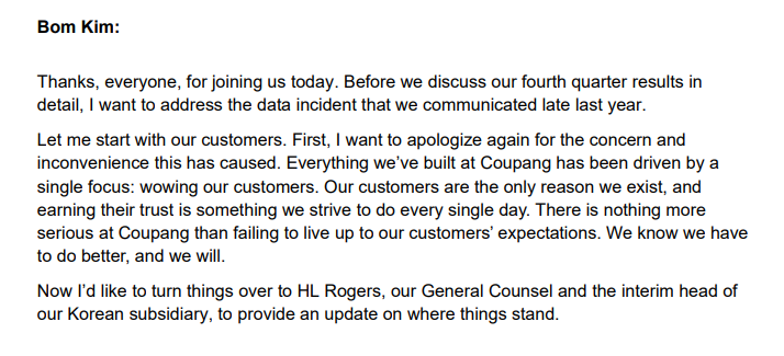 김 의장은 27일(현지시간) 4분기 실적 컨퍼런스콜에서 "개인정보 사고로 인해 고객 여러분에게 끼친 심려와 불편에 대해 다시 한번 사과드린다"고 말했습니다.