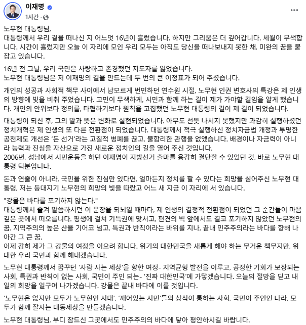 이재명 더불어민주당 대선후보가 고 노무현 전 대통령 서거 16주기인 23일 "노무현은 없지만 모두가 노무현인 시대, 깨어있는 시민들의 상식이 통하는 사회, 국민이 주인인 나라, 모두가 함께 잘 사는 대동세상을 만들겠다"고 강조했습니다.