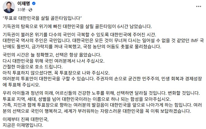 더불어민주당 이재명 대선 후보는 제21대 대선 투표일인 3일 "오직 투표만이 무도한 내란을 멈추고 새로운 희망의 시대를 열 수 있다"며 투표 참여를 호소했습니다.