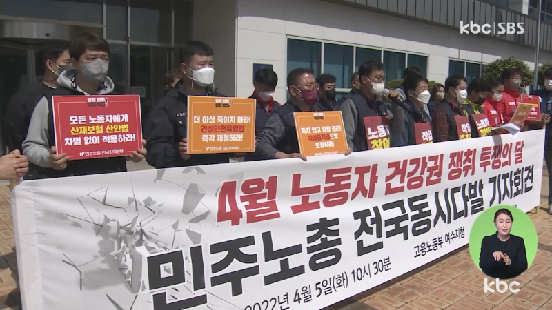 민주노총 전남본부는 오늘(5일) 여수고용노동지청 앞에서 '노동자 건강권 쟁취 투쟁의달 선포' 전국 동시 기자회견을 열였습니다.