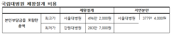 국회 교육위원회 더불어민주당 문정복 의원(경기 시흥갑)이 국립대병원들로부터 제출받은 자료에 따르면, 올해 8월 기준 제왕절개 비용(본인부담금을 포함한 총액) 평균액이 가장 비싼 곳은 서울대병원(496만 2,000원)으로 나타났습니다.