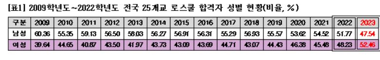 종로학원이 2009~2023학년도 전국 25개 로스쿨 신입생 선발 결과를 분석한 자료에 따르면 올해(2023학년도) 합격생 가운데 여성은 1,131명(52.46%)으로 1,025명(47.54%)인 남성 합격자 수를 웃돌았습니다.