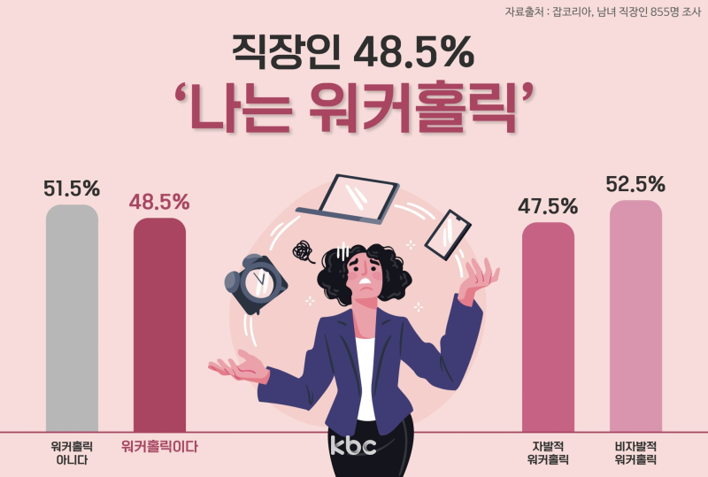 잡코리아가 지난달 14일부터 지난 5일까지, 직장인 855명을 대상으로 조사한 결과 응답자의 48.5%가 스스로를 '워커홀릭'이라고 답했습니다.자신이 워커홀릭이라고 답한 이들 중 52.5%는 '일이 많아 워커홀릭일 수밖에 없다'고 응답했습니다.