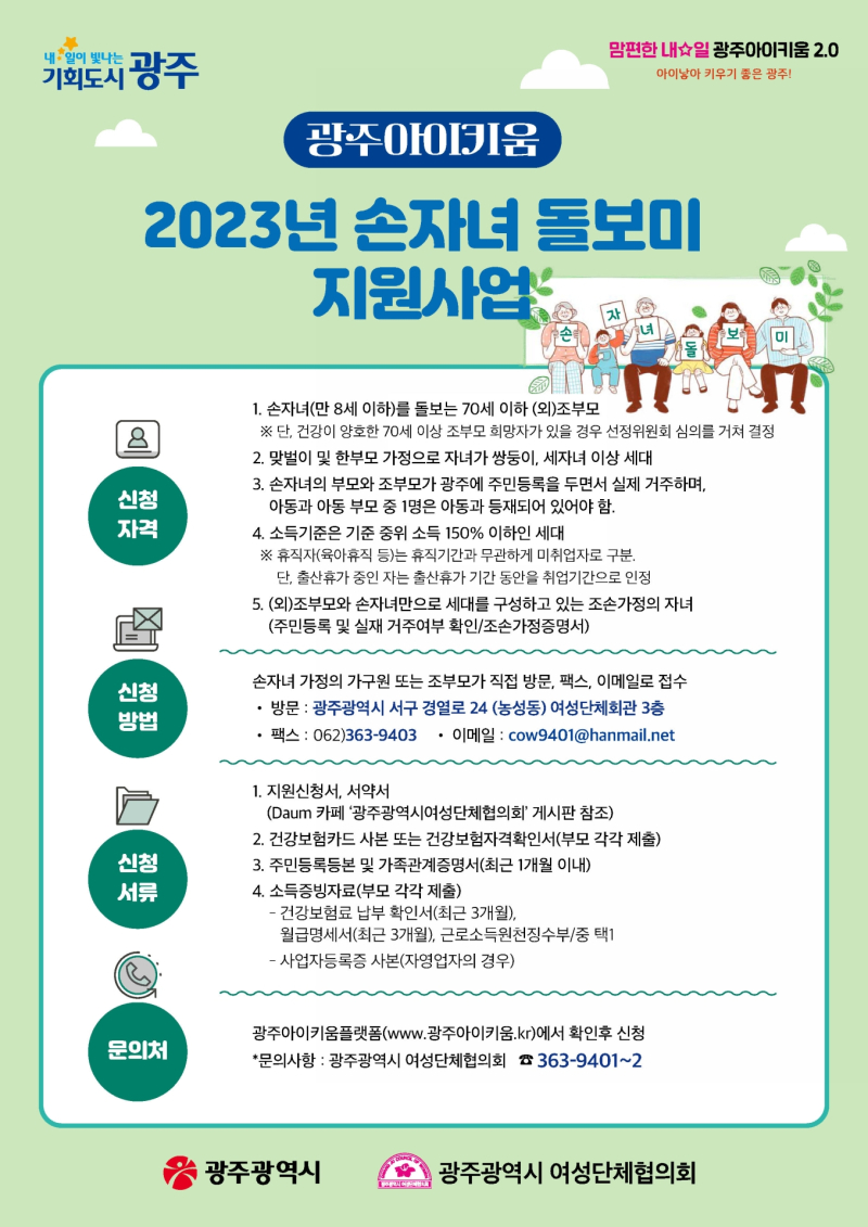 광주시는 쌍둥이 또는 3자녀 이상인 맞벌이 가정 중 만 8세 이하 손자녀를 돌보는 조부모에게 수당을 지원한다고 밝혔습니다.