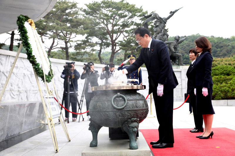 기시다 총리는 부인인 기시다 유코 여사, 기하라 세이지 관방부장관, 아이보시 고이치 주한 일본대사, 윤덕민 주일 한국대사 등과 함께 엄중한 분위기 속에 한국의 순국선열을 향해 참배했습니다.