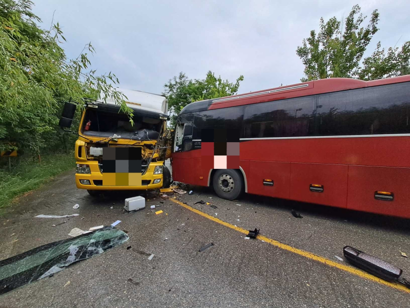 오늘(14일) 오후 5시쯤 강원도 강릉시 강동면의 한 도로에서 관광버스와 60대 A 씨가 몰던 11t 화물차가 충돌했습니다.