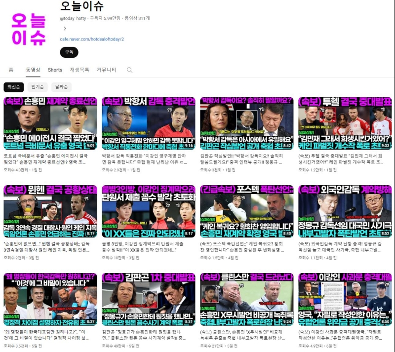 이 영상을 올린 채널은 축구 관련 영상 콘텐츠를 지난달 28일까지 21개 생성하며 약 313만 회의 조회수를 올리고 있습니다.