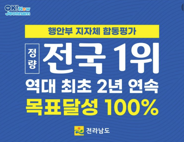 전라남도가 행정안전부의 2025년(2024년 실적) 지자체 합동 평가 결과 정량 지표에서 2년 연속 100%로 1위를 달성했습니다.