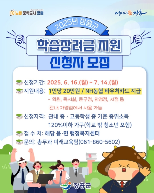 지원 대상은 장흥군에 주민등록을 두고 있는 지역 중·고등학교 재학생(학교 밖 청소년 포함) 가운데, 중위소득 기준 120% 이하 가구의 자녀입니다.