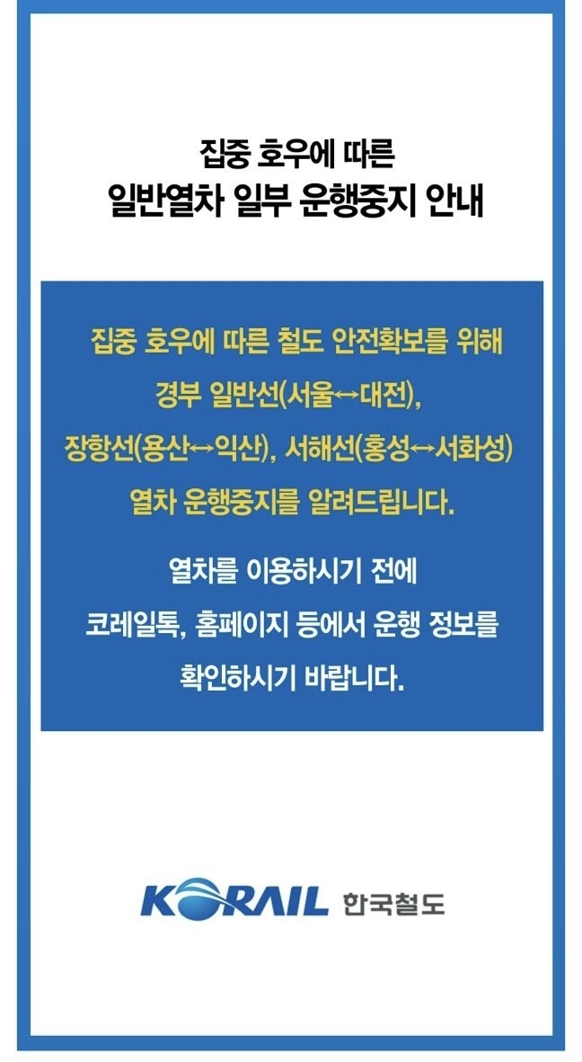 집중호우에 따른 열차 운행 중단 및 재개 상황은 앱 '코레일톡'과 레츠코레일 홈페이지, 또는 철도고객센터(☎1544-7788)를 통해 확인할 수 있습니다.