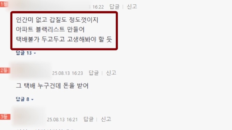 해당 사실이 온라인을 통해 확산되자 누리꾼들은 '인간미 없다', '갑질이다', '관리사무소 앞에 택배를 쌓아놔야 한다'는 등의 반응을 보이며 들끓었습니다.