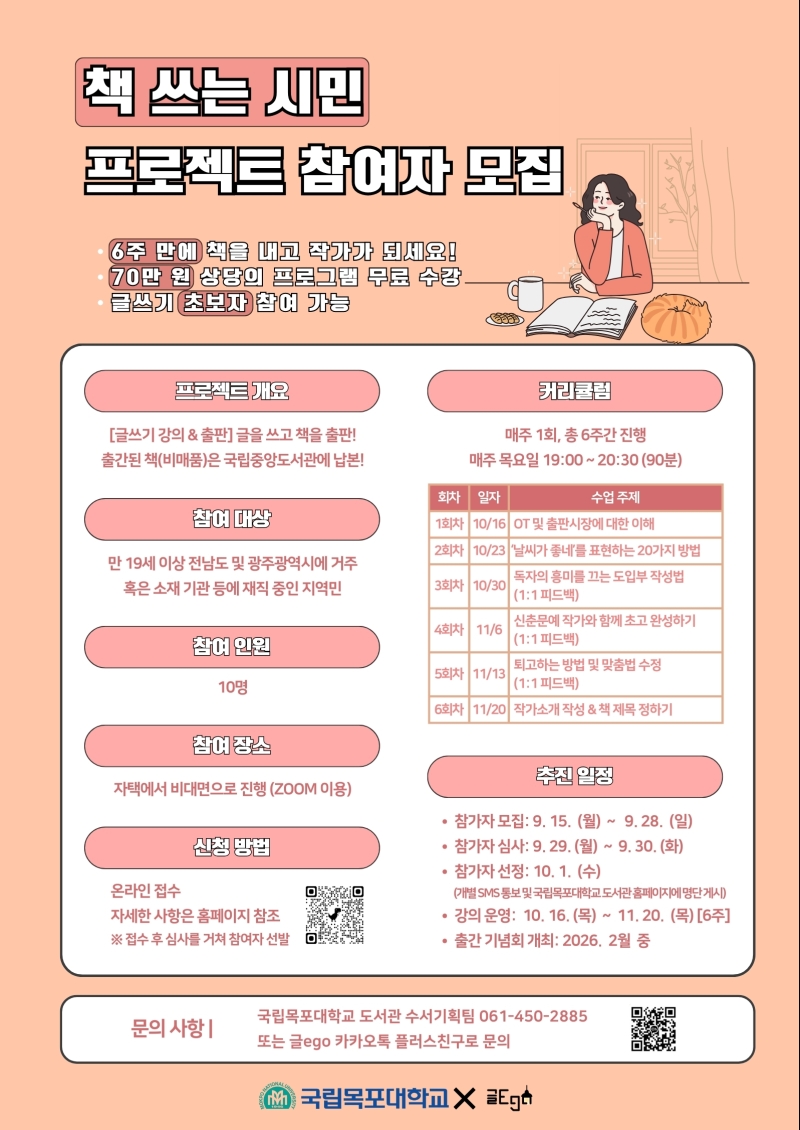 이번 국립목포대 도서관의 '책 쓰는 시민 프로젝트'는 10월 16일부터 11월 20일까지 6주간 주 1회 수업으로 진행되며, 매주 목요일 오후 7시부터 오후 8시 30분까지 90분 강의로 운영됩니다.