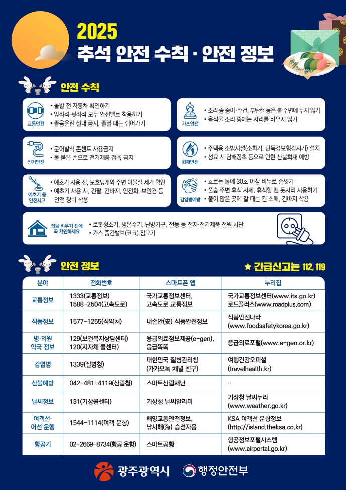 광주시는 안전한 명절 연휴를 위해 재난관리체계를 유지하고, 산불방지 상황실 운영, 다중이용시설 안전점검 등 안전사고에 적극 대응합니다.