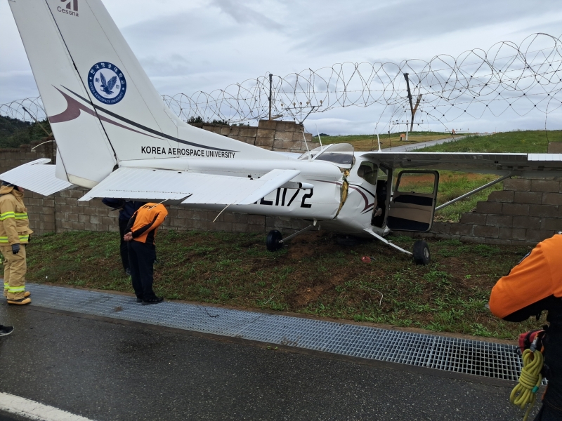 소방 당국 등에 따르면 사고 비행기는 세스나 172기로, 착륙 도중 출장소 담벼락에 기체 앞부분이 충돌한 뒤 불시착했습니다.