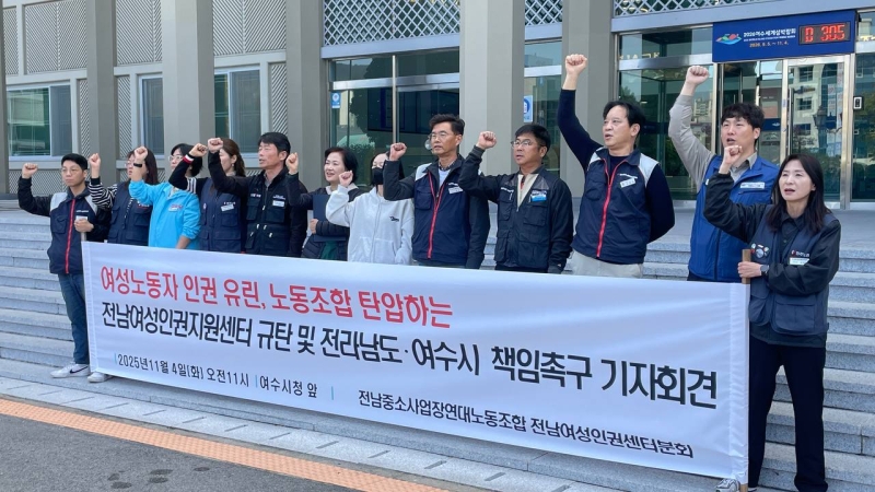 민주노총 전남중소사업장연대노조 전남여성인권센터 분회는 4일 여수시청 앞에서 기자회견을 열고, "직장 내 괴롭힘과 부당 노동행위 등에 대응하기 위해 노조를 설립한 지 닷새 만에 분회장에 대한 인사발령이 났다"며 "개인 동의 없는 인사 발령은 부당전적에 해당하며, 이는 근로기준법 제23조에 의거해 부당해고에 속하는 범죄행위"라고 주장했습니다.