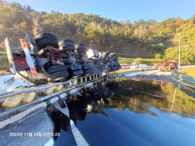 다행히 인명피해는 없었지만 트레일러에 연결된 탱크로리가 넘어지면서 아스팔트유 25t이 도로에 쏟아졌습니다.