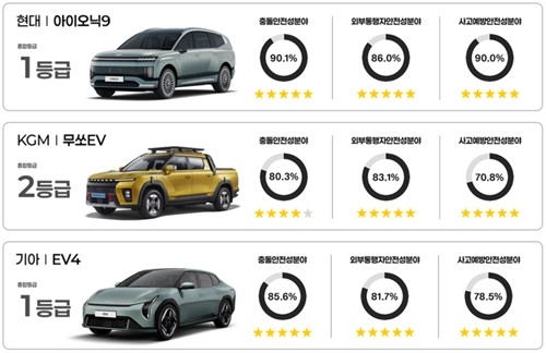 국토교통부는 한국교통안전공단(TS) 자동차안전연구원과 실시한 '2025년 자동차안전도평가(KNCAP)'에서 현대차 아이오닉9과 팰리세이드·넥쏘, 기아 EV4가 최고 등급인 1등급을 획득했다고 17일 밝혔습니다.