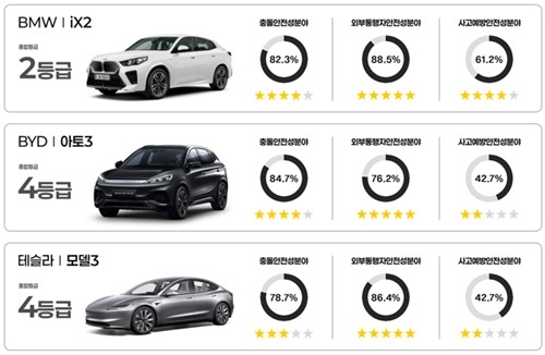 혼다 CR-V는 3등급을, BYD 아토3와 테슬라 모델3는 4등급을, 포드 익스플로러는 5등급을 각각 획득했습니다.