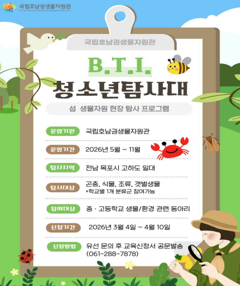 국립호남권생물자원관은 중·고등학교 생물 관련 동아리를 대상으로 생물자원 전문가와 함께하는 현장 탐사 프로그램 'B.T.I.(Bio Treasure Island, 섬 생물자원) 청소년 탐사대'를 운영합니다.
