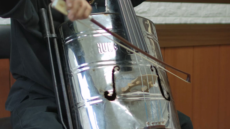 ▲이승규 작곡가: (첼로 몸통은) 스테인리스 농약 분무기통을 썼고요. 고물상에 다 주워왔습니다. 그래서 재밌는 것은 자세히 보면 콰르테 (첼로) 4대가 있는데 다 메이커가 다릅니다.