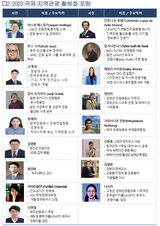 12월 13일부터 15일까지 제주에서 열리는 '2023 국제 지역관광 활성화 포럼'에서는 한국과 경제개발협력기구(OECD), 유엔세계관광기구, 호주, 인도네시아, 태국, 일본 등의 전문가와 학계는 물론 제주도, 정선군, 고창군, 양양군 등 다양한 지역관광 주체가 참석한 가운데 한국 사회가 대면한 지역 격차와 인구감소 문제에 대한 관광의 역할을 구체화합니다.