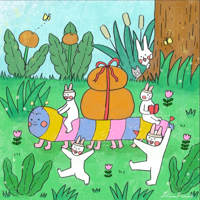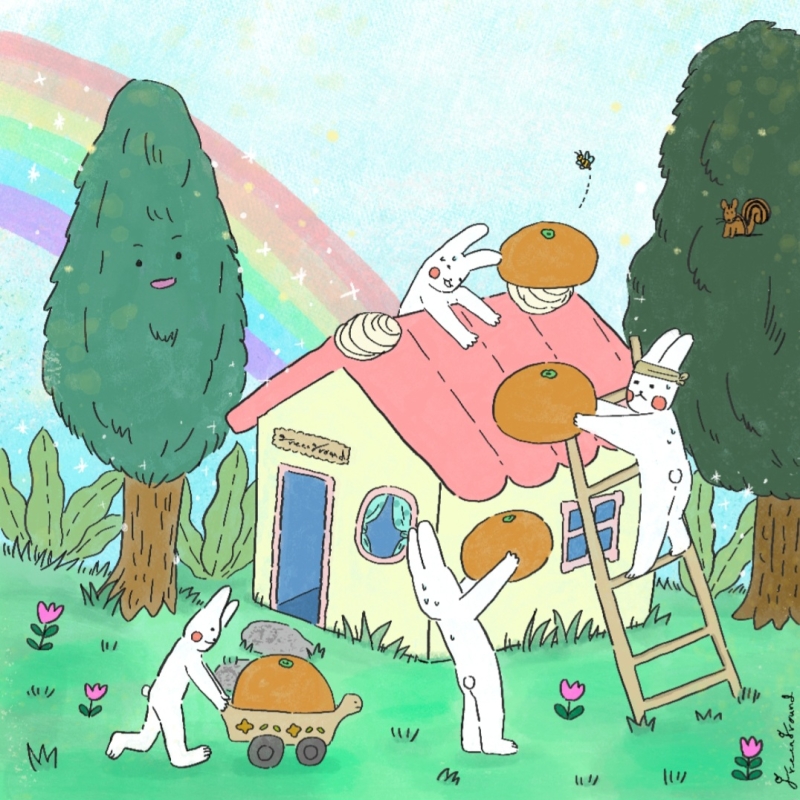 그리하여 토끼들은 어서 가져가라며 귤을 옮겨주는 호의를 베풀어주고 있습니다.