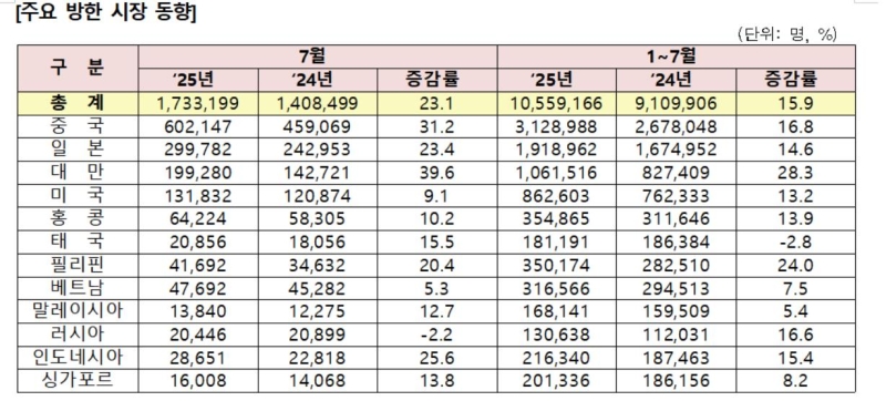 한국관광공사는 29일 발표한 '2025년 7월 한국관광통계'에서 지난달 방한객이 173만 3,199명으로 작년 동기보다 23.1% 증가했다고 밝혔습니다.