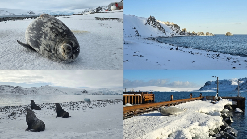 ▲ 세종기지의 다양한 동물-왼쪽 위부터 시계방향, 웨델 해표, 젠투펭귄, 게잡이 해표, 남극물개('25.09.21)