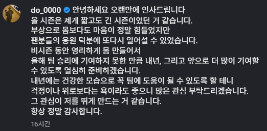 이어 "비시즌 동안 영리하게 몸 만들어서 올해 팀 승리에 기여하지 못한 만큼 내년, 그리고 앞으로 더 많이 기여할 수 있도록 열심히 준비하겠다"며 "내년에는 건강한 모습으로 꼭 팀에 도움이 될 수 있도록 할 테니 걱정이나 위로보다는 욕이라도 좋으니 많은 관심 부탁드리겠습니다"고 전했습니다.