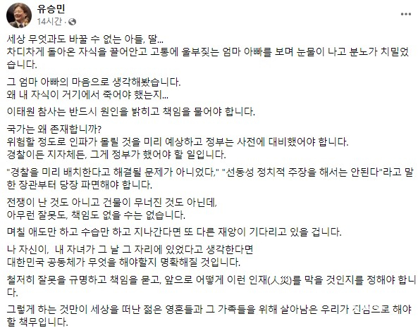 유 전 의원은 "철저히 잘못을 규명하고 책임을 묻고, 앞으로 어떻게 이런 인재(人災)를 막을 것인지를 정해야 한다"며 "그렇게 하는 것만이 세상을 떠난 젊은 영혼들과 그 가족들을 위해 살아남은 우리가 진심으로 해야 할 책무"라고 지적했습니다.