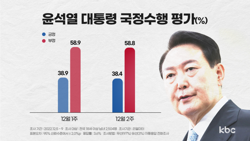 리얼미터가 미디어트리뷴 의뢰로 지난 5~9일 전국 만 18세 이상 성인 남녀 2,504명을 대상으로 조사를 실시한 결과, 윤 대통령의 국정 수행에 대한 긍정 평가는 지난주보다 0.5%p 하락한 38.4%로