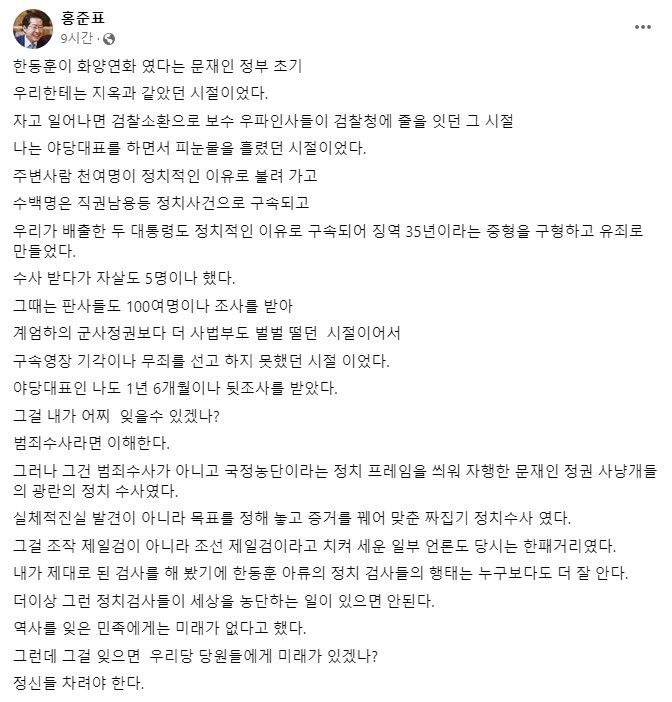 홍 시장은 7일 자신의 SNS에 "한동훈이 '화양연화' 했다는 문재인 정부 초기가 우리에게는 지옥과 같았던 시절이었다"며 "자고 일어나면 검찰소환으로 보수·우파 인사들이 검찰청에 줄을 잇던 때, 나는 야당 대표를 하며 피눈물을 흘렸다"고 회고했습니다.