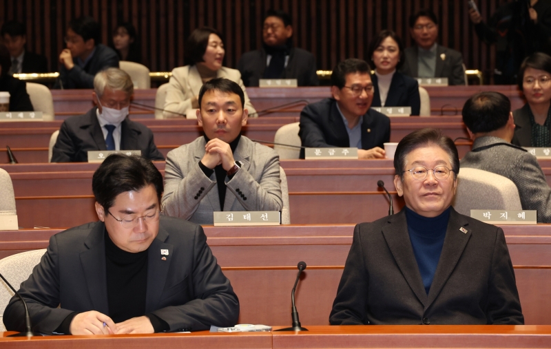 ▲ 더불어민주당 이재명 대표와 박찬대 원내대표가 8일 서울 여의도 국회에서 열린 비상 의원총회에 참석해 있다. [연합뉴스]