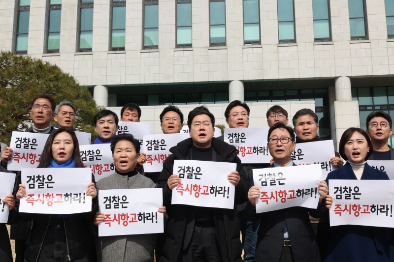 ▲ 더불어민주당 박찬대 원내대표 등 의원들이 8일 서울 서초구 대검찰청 앞에서 법원의 윤석열 대통령 구속 취소 결정 관련 검찰에 즉시 항고를 촉구하는 기자회견을 하고 있다. [연합뉴스]