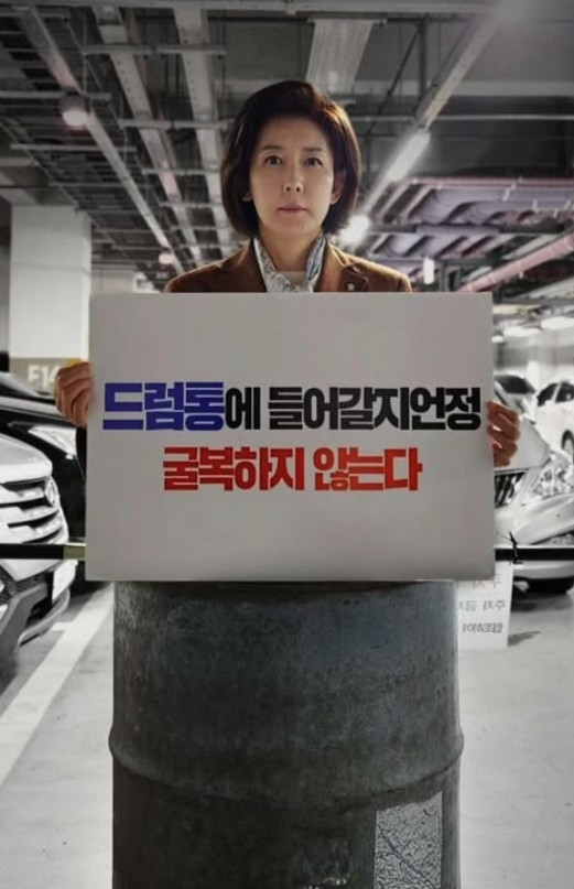 나 의원은 15일 자신의 SNS에 이같은 글귀가 적힌 팻말과 함께 드럼통 속에 서 있는 자신의 사진을 게시했습니다.