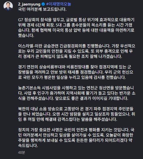 이재명 대통령은 이날 자신의 SNS에 '이재명의 오늘 국민 여러분께 보고드립니다'라는 제목의 글을 올려 "정치의 가장 중요한 사명은 국민의 안전과 평화를 지키는 것"이라며 이같이 약속했습니다.