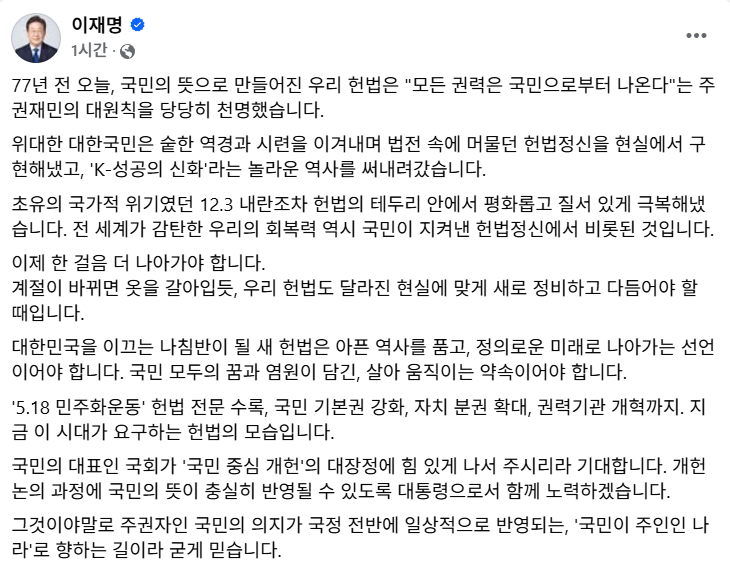이재명 대통령은 제77주년 제헌절인 이날 자신의 SNS에 "계절이 바뀌면 옷을 갈아입듯, 우리 헌법도 달라진 현실에 맞게 새로 정비하고 다듬어야 할 때"라며 이같이 밝혔습니다.