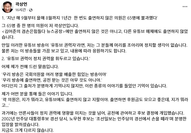 곽 의원은 "이러한 유튜브 방송이 '유튜브 권력자'라면 저는 그분들께 머리를 조아리며 정치할 생각이 없다"며 "'우리 방송에 출연하면 공천받는 것은 아무것도 아니다', 어디인지 출처가 분명하게 기억나지 않지만, 이런 종류의 얘기를 들었던 기억이 있다"고 덧붙였습니다.
