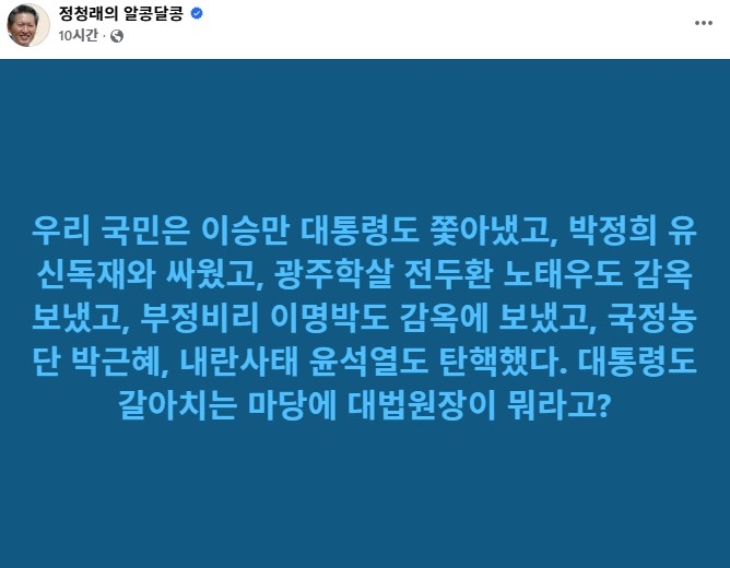 정청래 대표는 24일 자신의 SNS에 "우리 국민은 이승만 대통령도 쫓아냈고, 박정희 유신독재와 싸웠고, '광주학살' 전두환·노태우도 감옥에 보냈다. '부정비리' 이명박도 감옥에 보냈고 '국정농단' 박근혜, '내란 사태' 윤석열도 탄핵했다"고 적었습니다.
