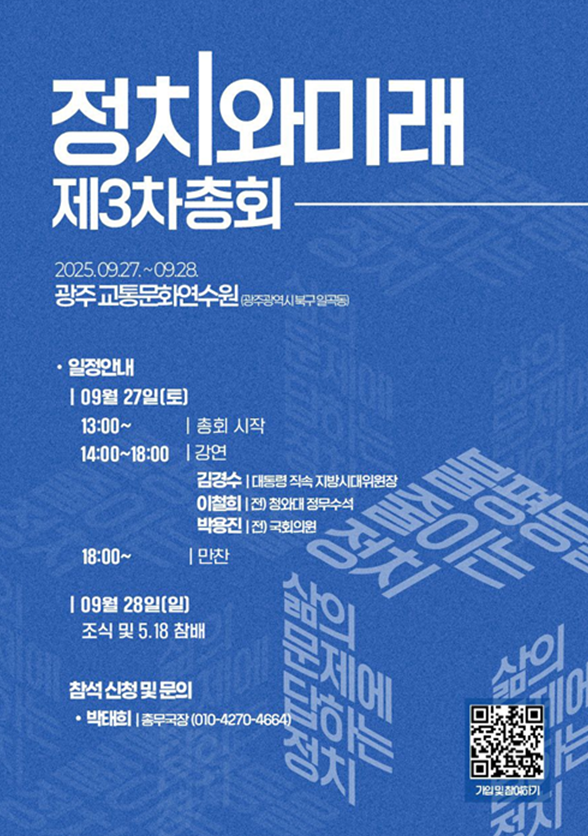 시민·당원 중심 정책 플랫폼을 지향하는 '정치와미래'(대표 우석훈)는 오는 27일부터 28일까지 광주교통문화연수원에서 제3차 총회 및 워크숍을 개최한다고 26일 밝혔습니다.