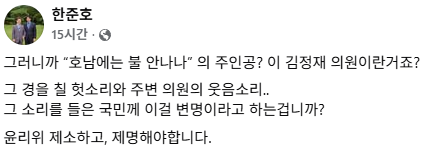 ▲ 민주당 한준호 최고위원이 자신의 SNS에 올린 글 [민주당 한준호 최고위원 페이스북]