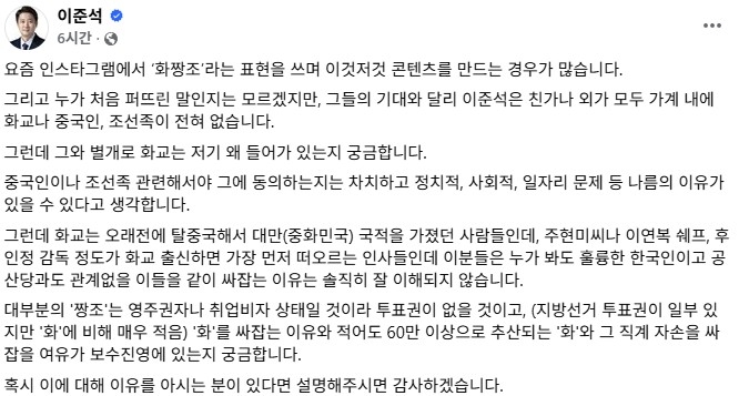 이 대표는 8일 본인의 페이스북에 "요즘 인스타그램에서 (자신에 대해) '화짱조'라는 표현을 쓰며 이것저것 콘텐츠를 만드는 경우가 많다"면서 "누가 처음 퍼뜨린 말인지는 모르겠지만, 그들의 기대와 달리 나는 친가나 외가 모두 가계 내에 화교나 중국인, 조선족이 전혀 없다"고 밝혔습니다.