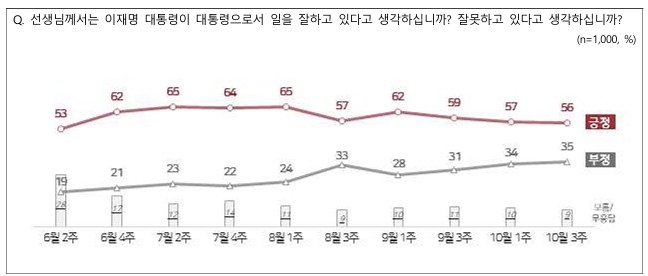 이재명 대통령의 국정 운영을 긍정적으로 평가한 비율이 지난 조사보다 소폭 하락한 56%를 기록했다는 여론조사 결과가 나왔습니다.