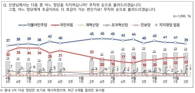 정당 지지도는 더불어민주당이 39%, 국민의힘이 23%였습니다.