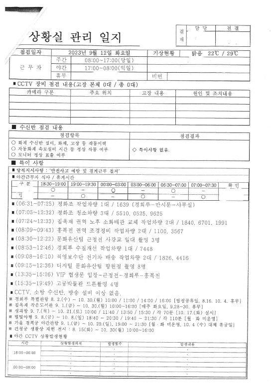 궁능유적본부 산하 경복궁관리소가 작성한 '상황실 관리 일지'에 따르면 김 여사는 오후 1시 35분부터 3시 26분까지 약 2시간 머문 것으로 파악됐습니다.