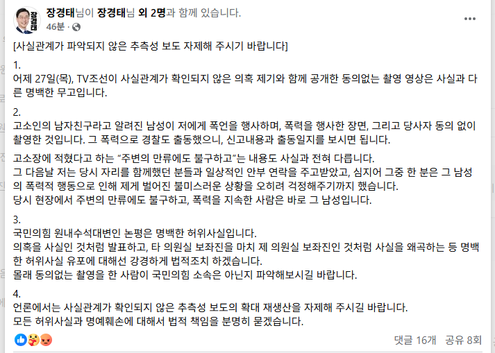 장 의원은 27일 TV조선 보도 속 영상이 사실과 다른 명백한 무고라고 주장했습니다.