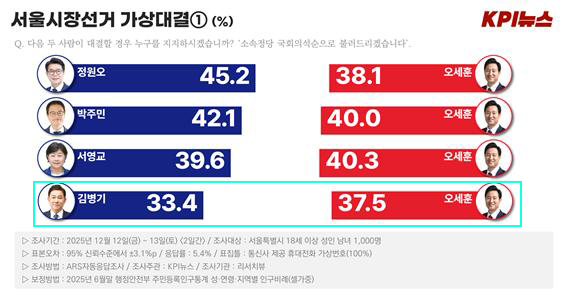 김병기 원내대표는 33.4%의 지지율을 기록해 오세훈 시장(37.5%)에게 4.2%포인트 차이로 밀렸으나, 이는 오차범위 내의 격차에 해당합니다.