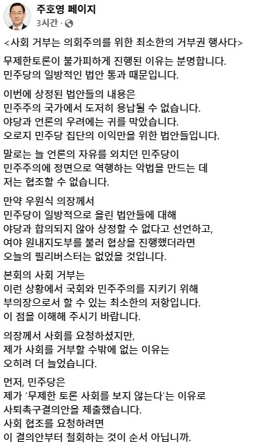 그는 "우 의장께서 민주당이 일방적으로 올린 법안들에 대해 야당과 합의되지 않아 상정할 수 없다고 선언하고, 여야 원내지도부를 불러 협상을 진행했더라면 오늘의 필리버스터는 없었을 것"이라며 "본회의 사회 거부는 이런 상황에서 국회와 민주주의를 지키기 위해 부의장으로서 할 수 있는 최소한의 저항"이라고 주장했습니다.